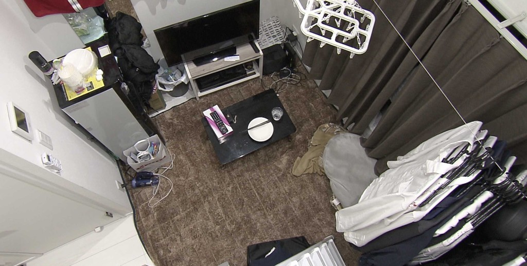 沿著牆壁擺著沙發、桌子、衣架、冰箱等起居用品,剩下的一小處空地就是細田睡覺的地方,雖然有著廁所跟淋浴設備,但這僅有1.5坪的小空間卻讓細田恭平非常滿足。這間迷你小套房一個月租金約6.45萬日幣(約台幣2萬多元),居住2年以來,他並沒有覺得不妥,畢竟為了省去通勤與交通費,這勉強是個不錯的選擇。