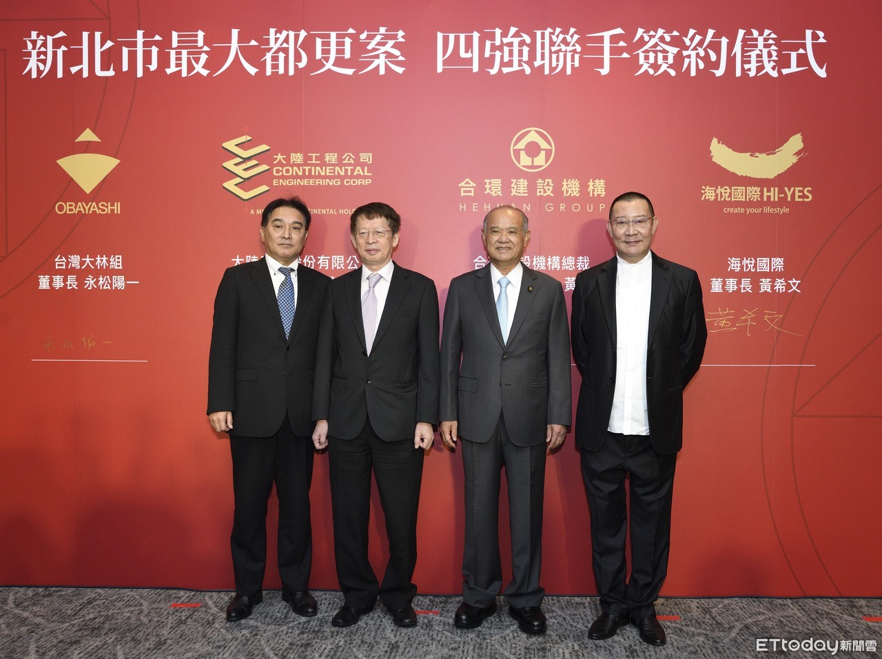 ▲新店地標都更案將由合環建設機構總裁黃正勝(右2)、大陸工程台灣事業處總經理陳學聖(左2)、台灣大林組營造董事長永松陽一(左1)、海悅國際董事長黃希文(右1)合作。(圖/記者湯興漢攝)