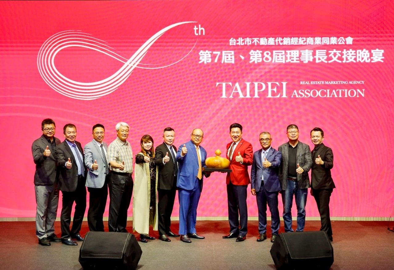 ▲慶祝台北市不動產代銷公會第八屆理事長由創意家行銷董事長王明正(右4)接任,致贈象徵薪火相傳賀禮予王明正理事長。