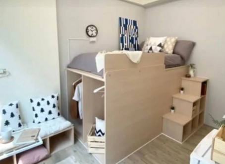 原PO在Dcard發文表示,她在租屋網上看到這種將床舖架高,下面設有衣櫃、一旁有收納樓梯的床架,向網友們詢問「這種床叫什麼?想買不知道哪裡有賣」,並附上在網站上看見的截圖內容。
