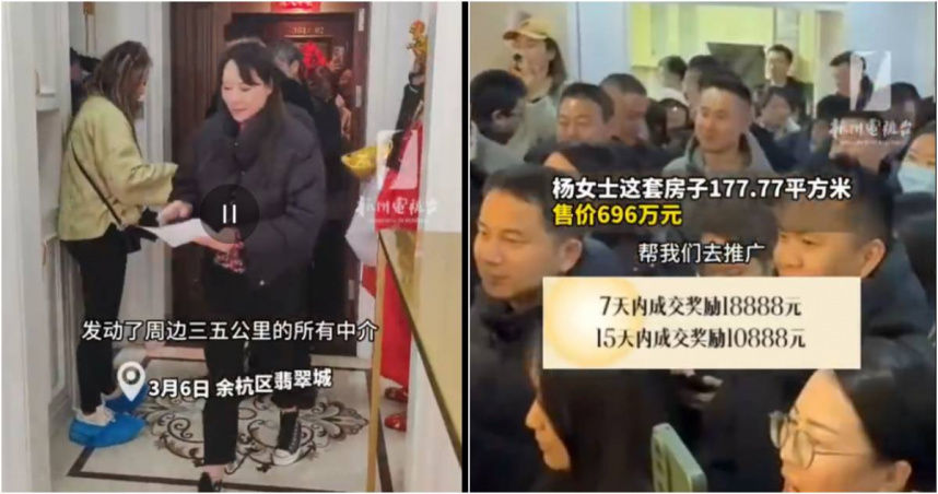 中國浙江省杭州一名女屋主為了急著賣掉自己名下一間公寓,竟廣邀週邊地區整整200名房仲同時到她的公寓看房,現場不僅準備了餐點飲料招待,進門時甚至還發放「抽獎劵」。這名女屋主向在場200名房仲承諾,若能在7天內賣掉房子,自己除了該有的佣金,還會額外奉上人民幣18888元(約新台幣8.5萬元)的大紅包;15天內成交者,也有10888元(約新台幣4.9萬元)的獎勵,讓在場房仲直呼:「從來沒見過這種事!」