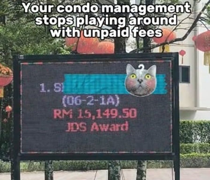 星洲網報導,這棟公寓大型電子螢幕所顯示的資訊並非社區公告,而是把拖欠管理費的住戶公開。依據社群媒體平台流傳的影片,拖欠管理費的住戶不只一戶,除了最多積欠逾1.5萬令吉未繳的人之外,還有另外2名住戶分別拖欠8000多令吉(約新台幣6.3萬元)及5000多令吉(約新台幣3.9萬元)。