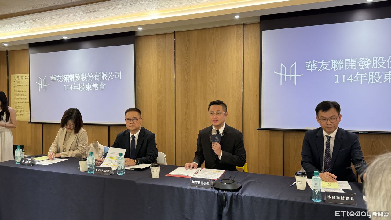 ▲華友聯開發(1436)22日舉行股東會,會中決議發放現金股利每股10.12元、股票股利3.11元,創歷年新高。董事長陸炤廷(右二)表示,房市受到多重因素夾殺轉為買方市場。(圖/記者張雅雲攝)