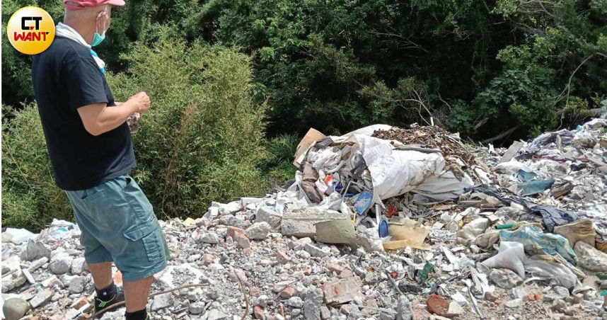 深居新竹市香山區60年的老黎(化名)帶著CTWant記者穿越車水馬龍的新竹茄苳景觀大道,一旁不起眼的泥土小徑卻詭異地充滿大車壓痕,老黎直指那裏面是別有故事,入口處還刻意鑿深形成了泥濘水窪,記者開著車子卻在這漥水坑裡卡住了,兩人索性下車直接步行上坡,沿路磚頭與木材混雜的廢物佈滿,走馬了約300公尺到達東香段420號目的地,眼前卻怵目驚心。