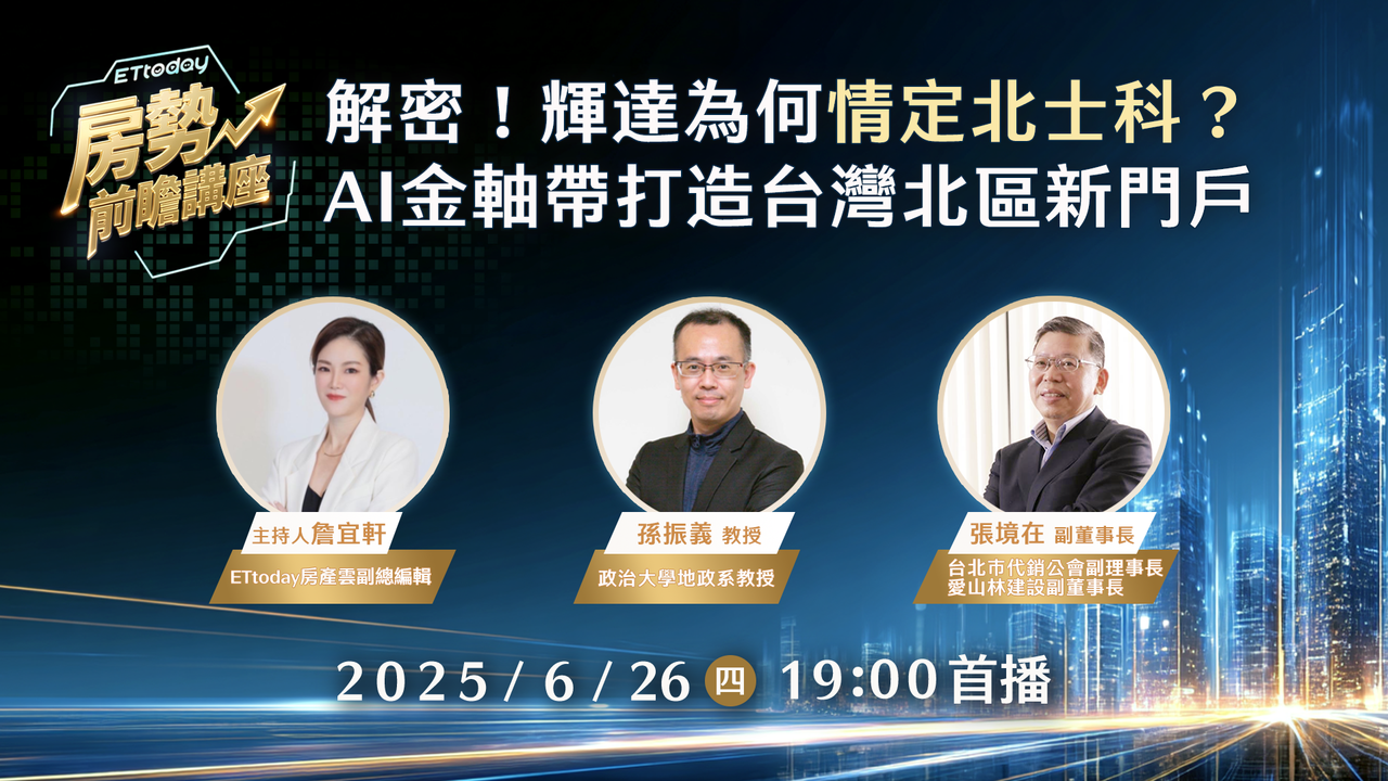 「 ETtoday房勢前瞻講座」第一集攜手國內指標性代銷建設集團甲山林,針對台灣AI科技產業、輝達進駐北士科、台北市北區房市等面向進行深度探討與分析,將在6月26日晚間7點首播,內容扎實精彩,絕對收穫滿滿,記得鎖定ETtoday新聞雲FB專頁、ETtoday房產雲FB專頁、《雲端最有錢》YT頻道、《ETtoday播吧》。