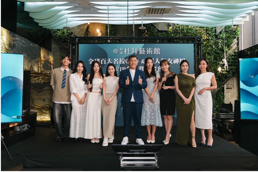 ▲科達建築董事長賴建程(中)宣布大巨蛋指標新案「杜拜藝術館」開賣,邀請不少藝人與主播站台,包括藝人炎亞綸(左起)、三立主播高毓麟、啦啦隊女神梓梓、鄉民女神鄔又曦,以及知性主播張宇(右起)、房產女神朱琦郁、時尚主播劉涵竹、蛇姬林采緹皆同台支持。