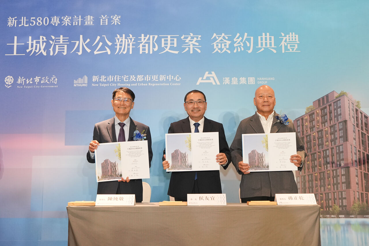 新北住都中心指出,土城區「清水段103地號1筆土地都市更新事業」招商案,於22日上午舉行了簽約儀式。新北市市長侯友宜親自見證,由新北住都中心董事長陳純敬與漢皇集團漢吉建設董事長孫正乾共同簽署合作契約。土城清水案為「580專案計畫」首案,預計於118年開工、122年可望取得使用執照。