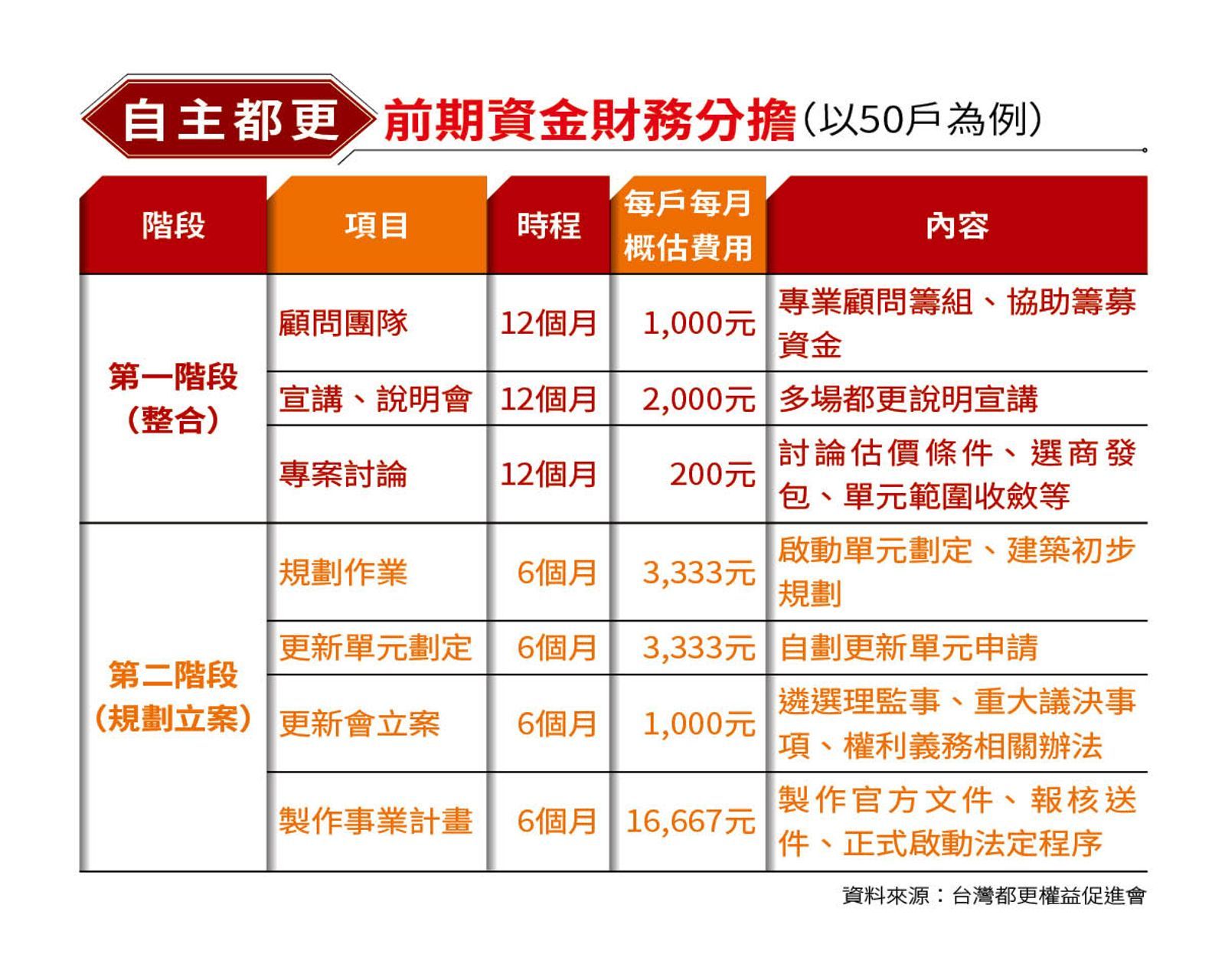 對於自主更新的前期預備金,目前雙北政府也都提供補助,北市府總補助款為580萬元,新北市府為630萬元,分階段給予,「前期工作包括說明會、地籍調查、更新單元劃定等流程都要支出,可利用政府補助,讓荷包喘息。」林注強說,等待土地信託、銀行核准撥款,就能還給地主這筆支出。
