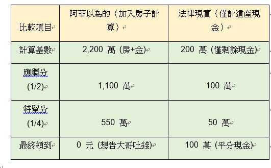 阿華認為遺產總額應該是 2,200 萬(房子+存款)。兩人應繼分至少各 1,100 萬,就算僅有特留分,至少也有 550 萬,但是現在存款卻只有 200 萬。