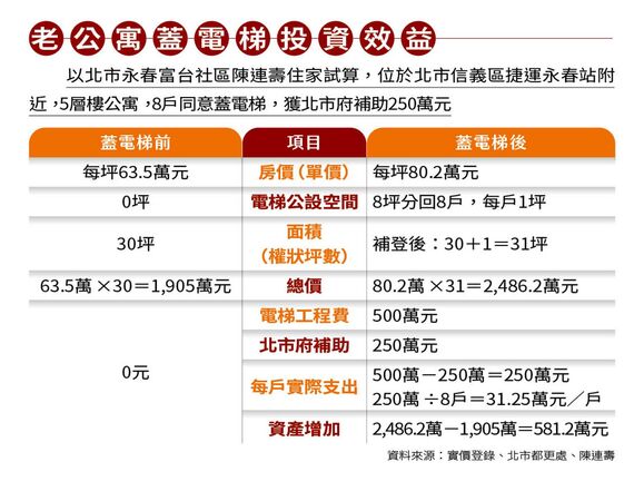 2021年信義富台社區申請北市府「整維得來速」B套餐,電梯造價500萬元,扣掉當時補助250萬元,8戶同意戶平均每戶出資31.25萬元。陳連壽原本權狀30坪,電梯完工後補登1坪,變31坪。根據實價登錄,該社區房價從每坪63.5萬漲到80.2萬,他的房子總價從1,905萬變成2,486.2萬,增值581.2萬。